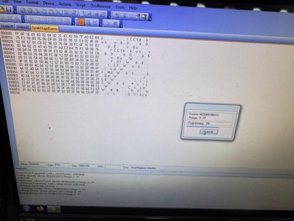 Usamos un programador UPA para leer la EEPROM y revisar los datos en hexadecimal. Desde la línea 005, encontramos el valor que corresponde al kilometraje que se ve en el tablero. Para solucionar el problema, lo que hacemos es modificar este valor y cambiarlo por uno correcto, que refleje el kilometraje real del vehículo.