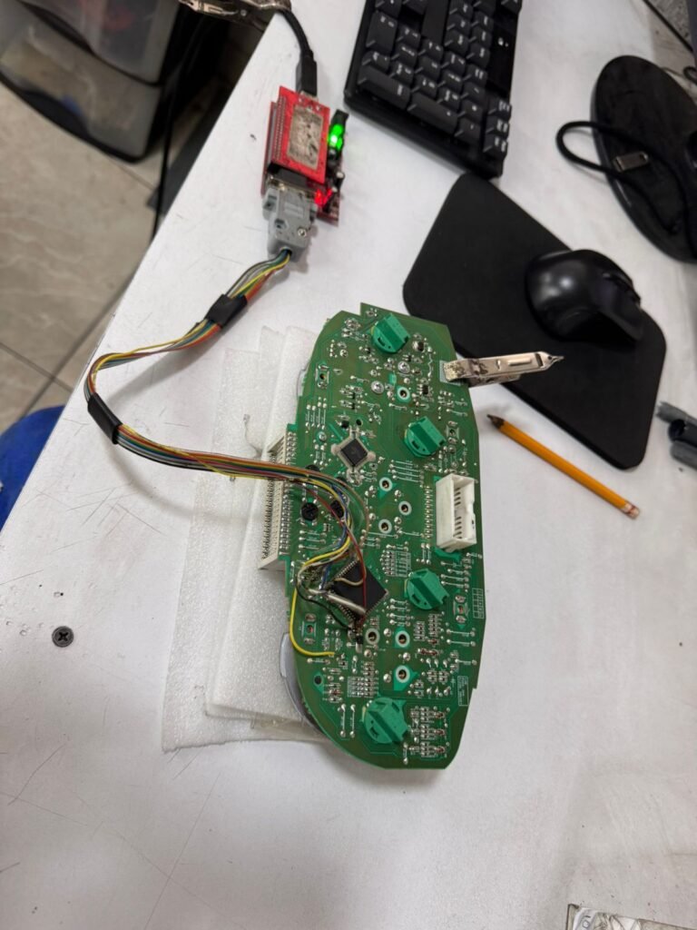 El salto del kilometraje generalmente ocurre debido a fallos en el tablero, en particular en el microcontrolador que almacena la información del kilometraje. Para corregirlo, lo primero que hacemos es bajar el tablero y conectarnos al microcontrolador HC05H12 que contiene la EEPROM, donde se almacena el kilometraje.