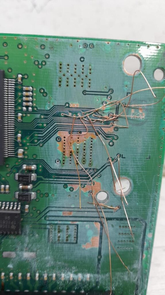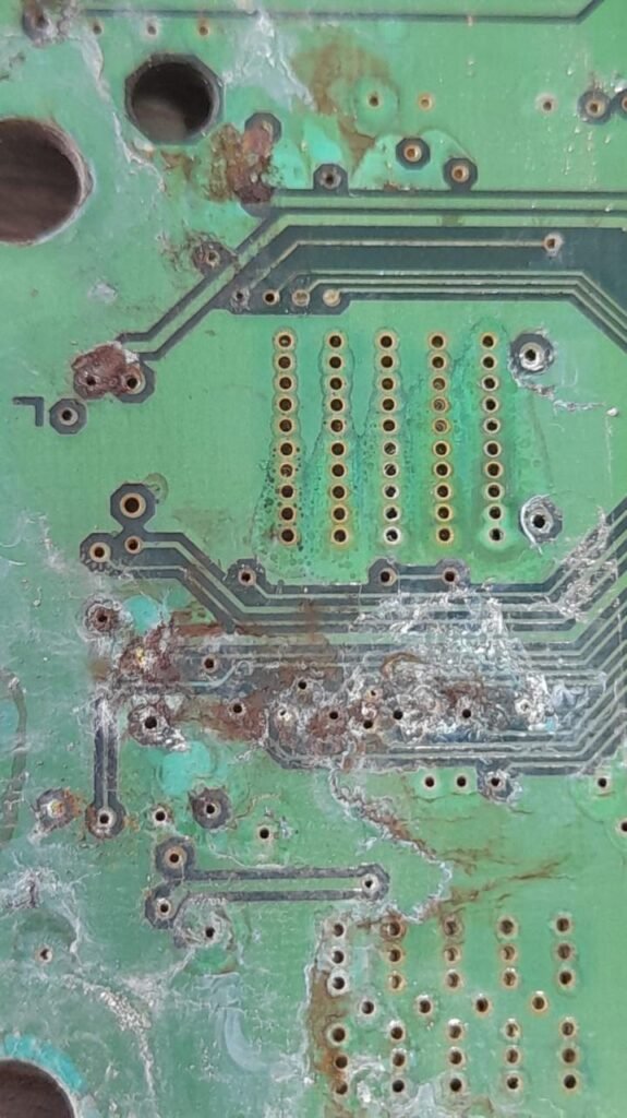 Aunque pueda parecer extraño, esto sucede cuando el vapor generado por un termostato defectuoso sube por los cables y llega a la computadora. La reparación puede resultar tediosa, pero con paciencia es posible hacer una limpieza exhaustiva. Además, es necesario realizar puentes mediante cables en todas las pistas afectadas de los integrados. En algunos casos, incluso es necesario reemplazar algunos de los integrados dañados.